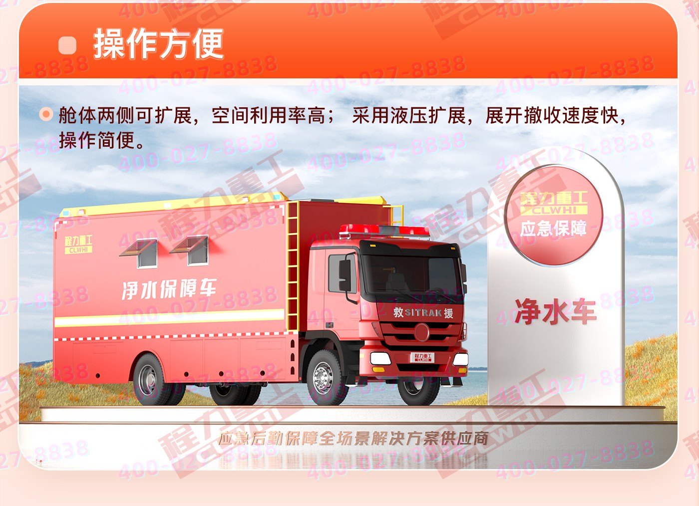 用于應急消防,軍隊作戰,部隊野外作業、部隊戰地演習、戰地醫院;地震、洪災、泥石流等自然災害發生時野外原水凈化,清潔水攜帶,凈水及開水供應功能。