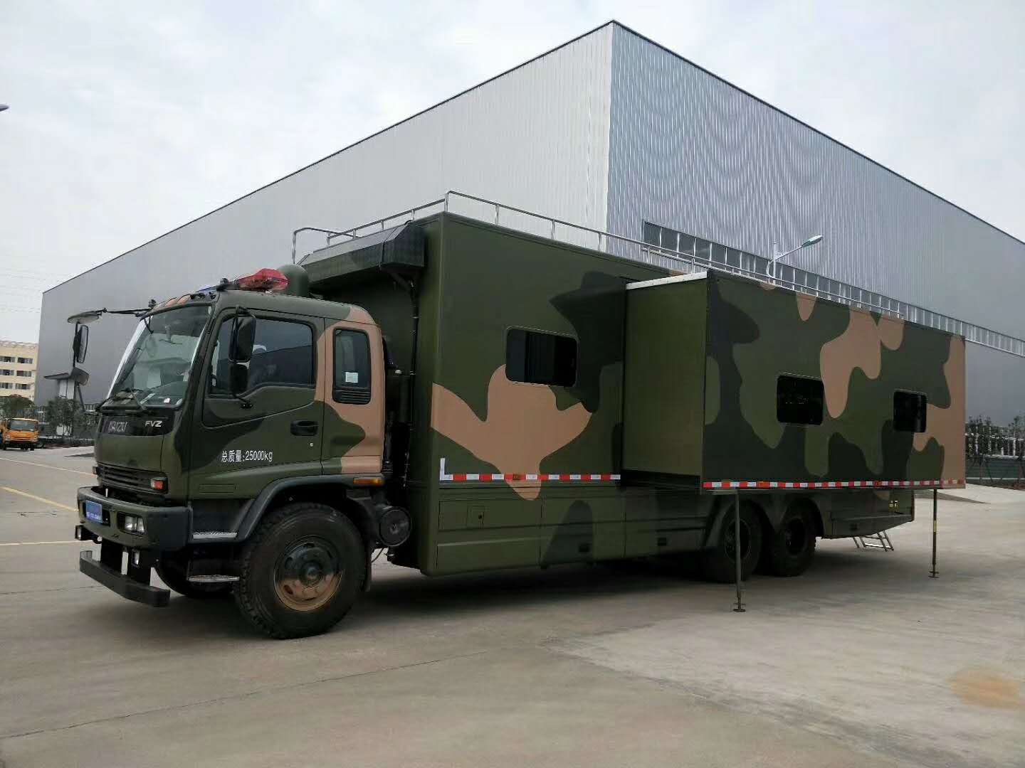 五十鈴底盤、箱體(鋼骨架、內、外蒙皮)擴展宿營方艙、宿營設施、上下床鋪、空氣調節系統、影視系統、電氣系統、安全系統整車配備衛生間、廚房柴油發電機、蓄電池、凈水箱、污水箱‘暖風機、兩臺空調外加輔助裝備等。
